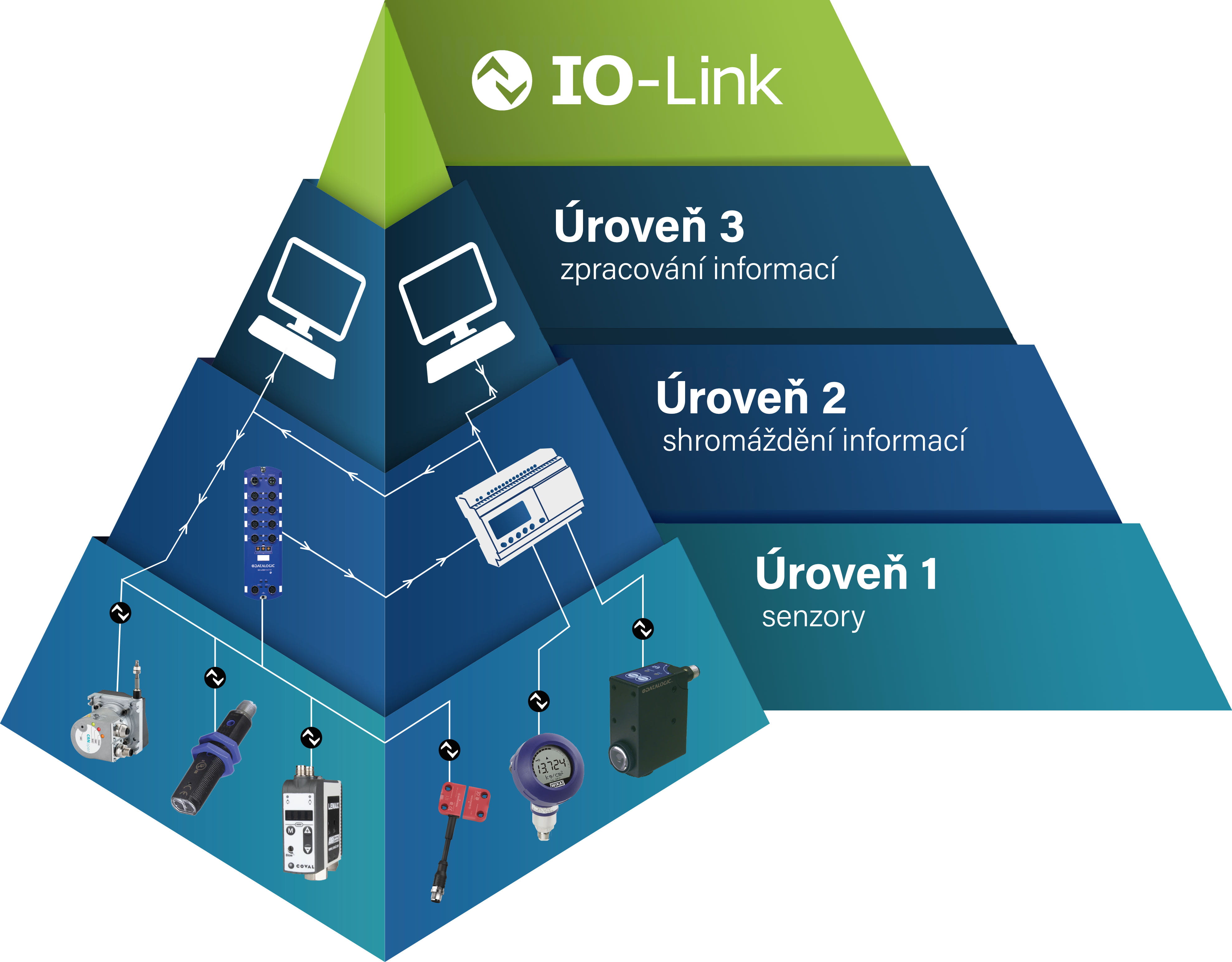 Na pyramidě vidíte, jak může několik různých produktů komunikovat se stejným masterem a poté předat informace do software, který je může upřesnit. Také je možné posílat informace přímo z úrovně senzorů do software.